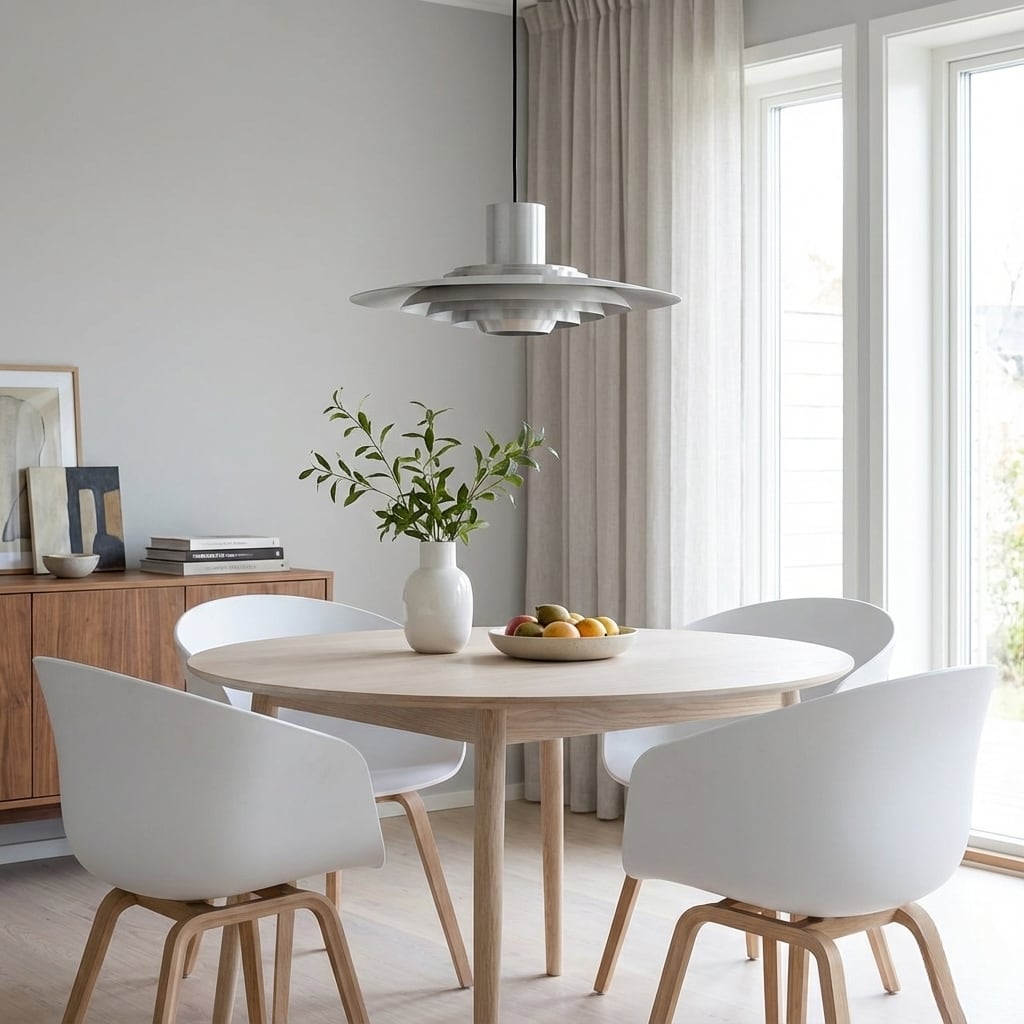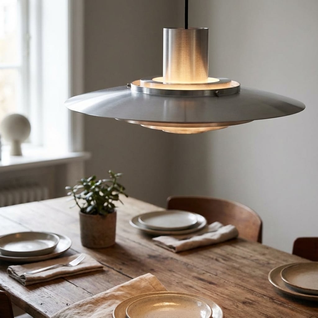 P376シリーズは、その思想を象徴する代表作のひとつで、幾重にも重なるアルミシェードが光をやわらかく拡散し、静謐(せいひつ)で彫刻的な佇まいを生み出します。