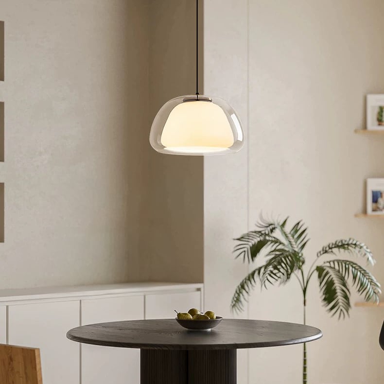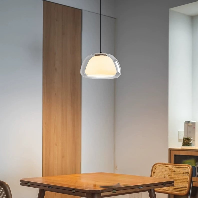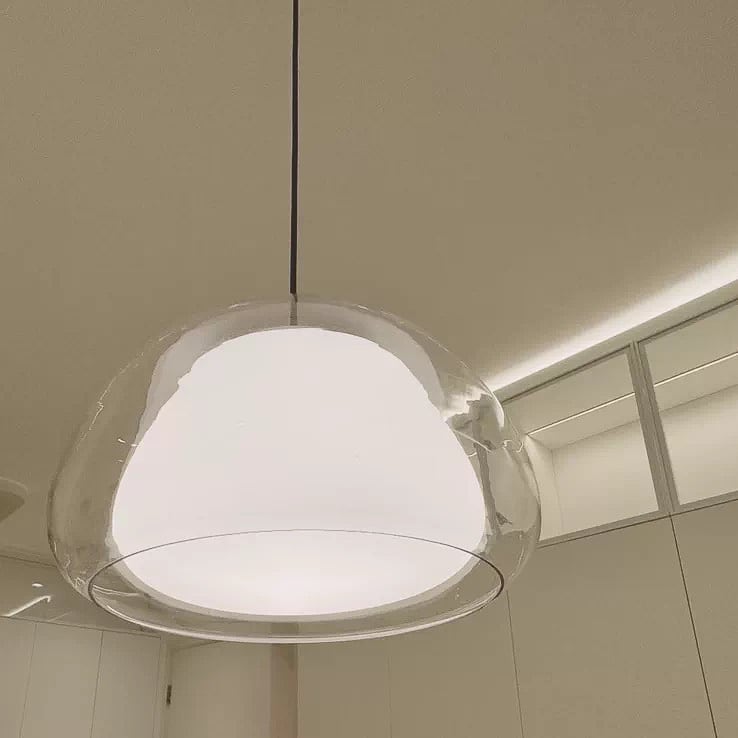 透明感のあるガラスシェードにやわらかな光を閉じ込めた、シンプルかつ洗練されたペンダントライト。丸みを帯びたフォルムから広がる光は、まるで空間を包み込むオブジェのように、居心地のよい雰囲気を生み出します。