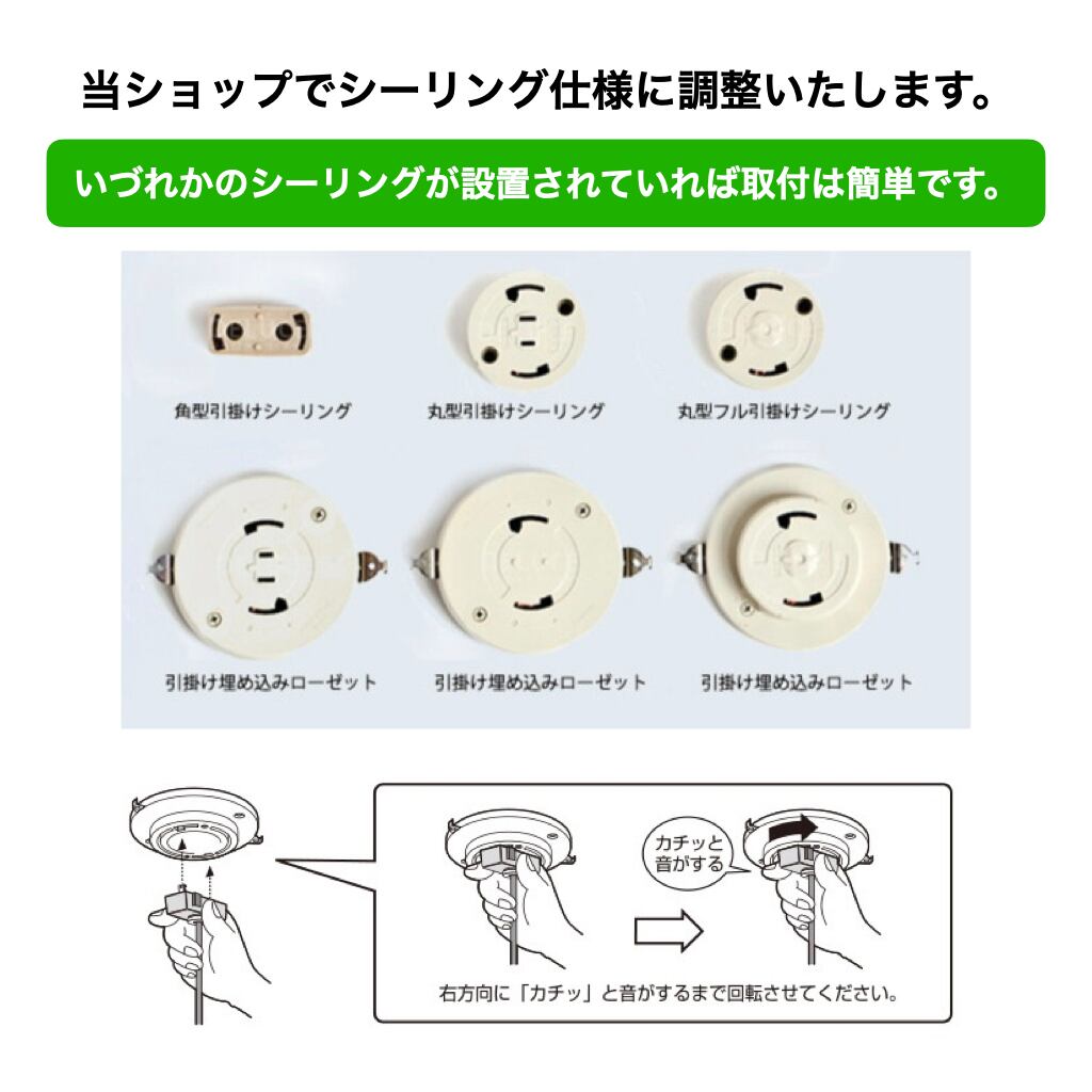当店では、シーリングカバーの取り付けオプションをご用意しております。必ずご家庭のシーリングの大きさや種類をご確認の上、ご選択いただけますようお願い申し上げます。また、シーリングカバーにつきましては、サービスオプションとして取り付けを承っております。サイズやカラーに関してご希望やご要望がございましたら、事前にお問合せいただければ可能な限り対応させていただきます。