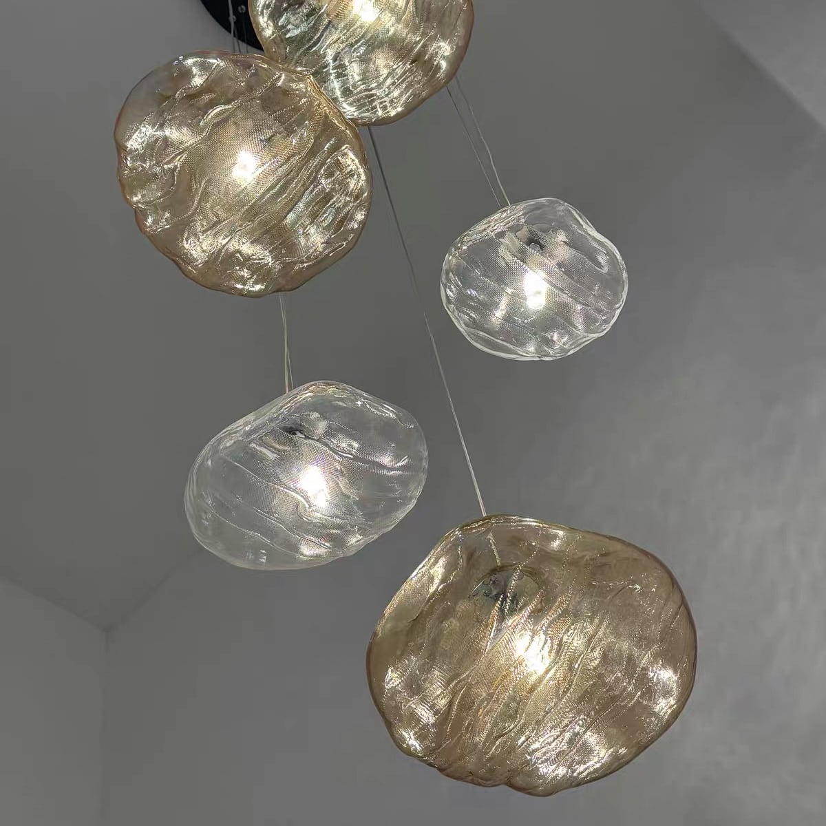 その独特の揺らぎと透明感が、空間に静かな動きをもたらし、ダイニングやカウンター上、リビングのアクセント照明に最適です。