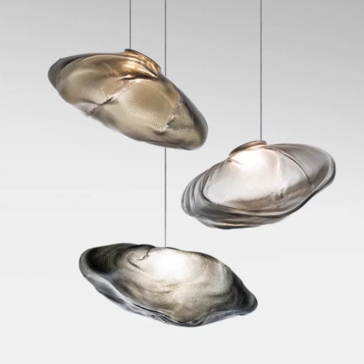 職人の手で一つひとつ成形されたガラスシェードは、機械的な均一さではなく、自然の造形美を宿した有機的なデザイン。